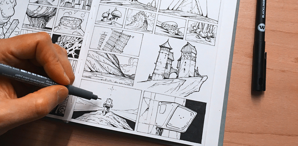 Over the past few years, I've been sketching a lot in this thumbnail format. For warm-up purposes, testing ideas and designs quickly, but also just for relaxation.