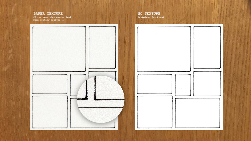 * And on a final note: I prepared two versions. One with paper texture for your digital sketching needs (Procreate, Photoshop or similar) and another without texture, optimized for printing!