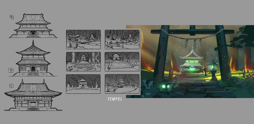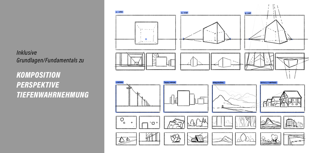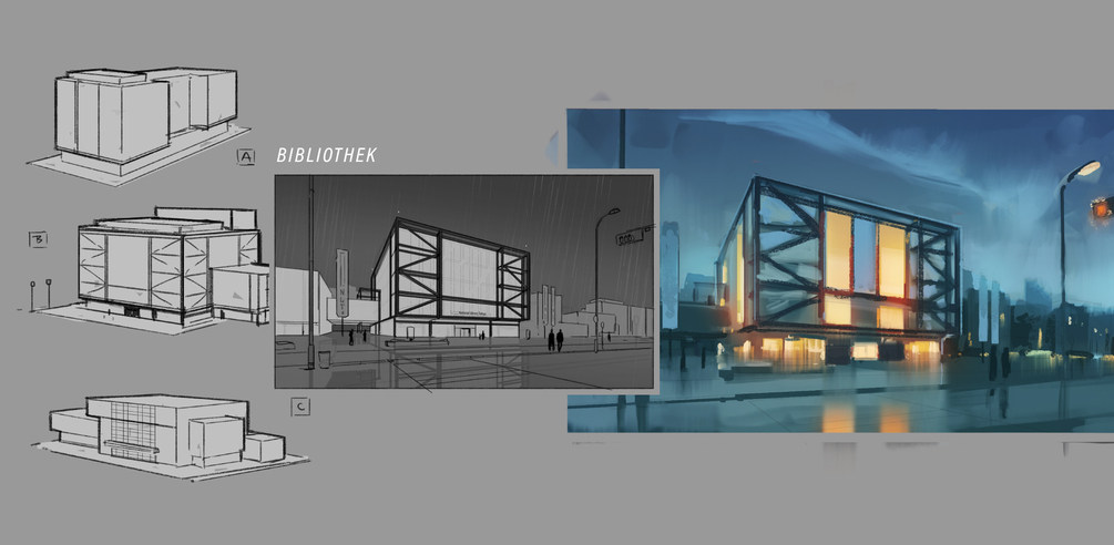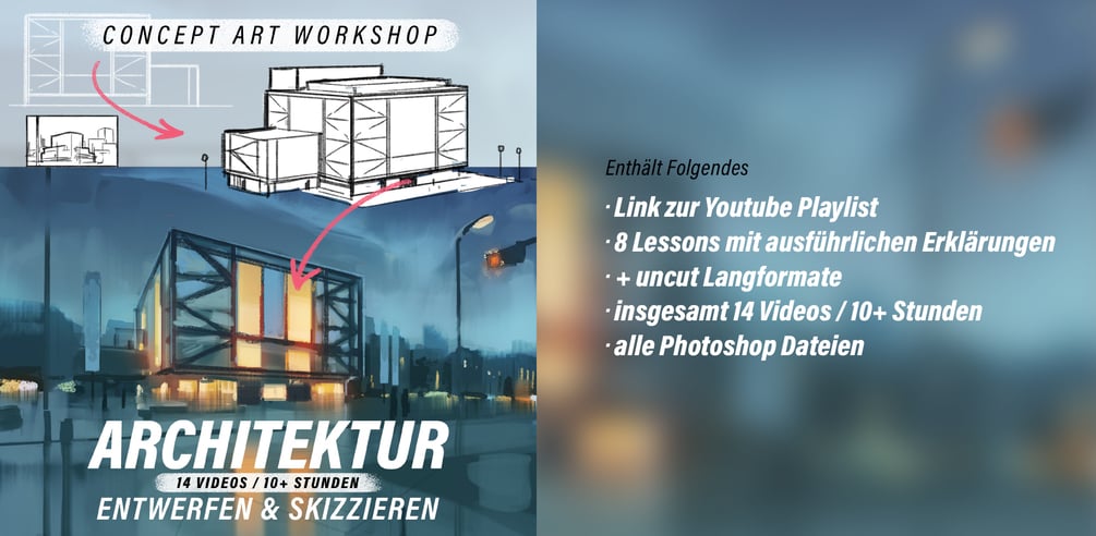 Dieser Concept Art Workshop ist als Einstieg für Anfänger und Interessierte konzipiert und in mehrere Lehr-Kapitel und Aufgaben geteilt. Wir entwerfen und skizzieren gemeinsam zwei Schauplätze mit jeweils einem Gebäude. Du lernst meine Arbeitsweise kennen und erfährst im Detail warum und wie ich meine Bilder und Designs entwerfe.